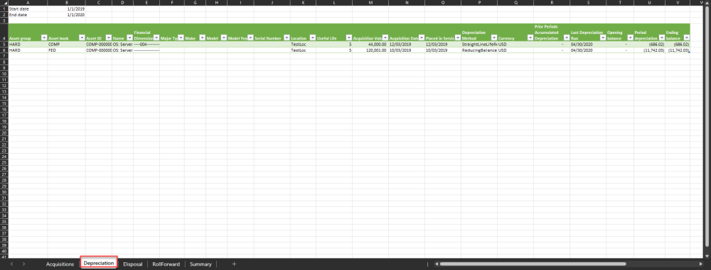 Shows the depreciation amounts and book value for a defined period for assets. The report is useful when you are using different depreciation methods for your assets and want to analyze a certain period’s depreciation