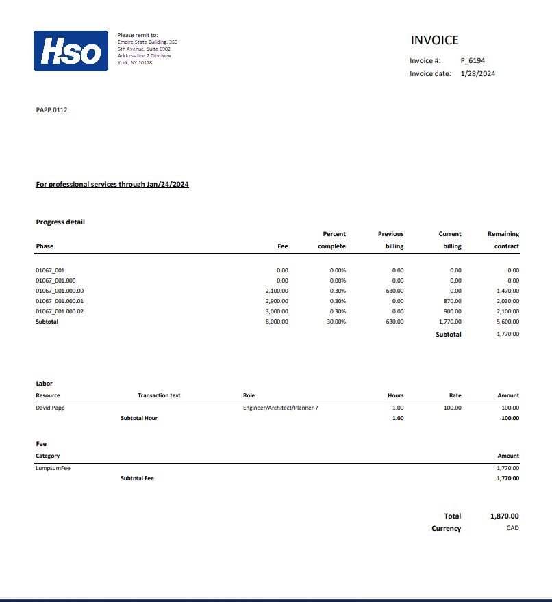 In an invoice proposal, you can select project transactions to include in a project invoice. You can then review the invoice details before you post the project invoice and send it to the customer or other funding source. This invoice supports several invoicing formats such as, Lump Sum or Progress billing, Time and Material (T&M) billing, Cost-Plus Fix Fee (CPFF) billing, and much more.